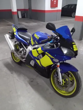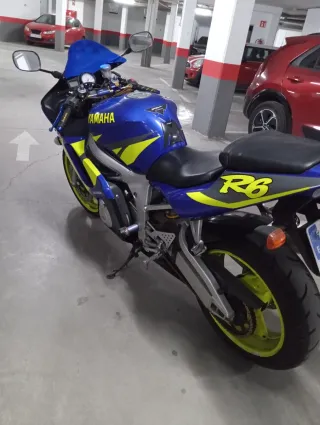 Moto deportiva Yamaha R6 del año 2002 con un diseño llamativo en azul y amarillo. Se vende por no usar y tener otra ruedas nuevas arranca a la primera dispone de amortiguador de dirección ITV hasta julio del 2027 kit de arrastre nuevo y dispongo también de asiento monoplaza y otro tubo de escape leo vince aparte del de serie tiene unos pequeños daños porque se me a caído limpiándola se ve en las fotos no a sido en movimiento ni nada se ve en las fotos se escuchan ofertas - Estilo deportivo. - Transmisión manual.