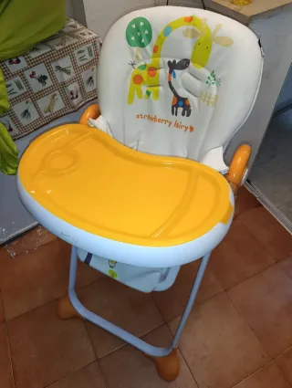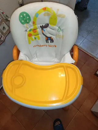 Silla de comer para bebés con un divertido diseño de jirafas y árboles. La funda es de color blanco con dibujos infantiles. - Funda con estampado de jirafas. - Bandeja de color amarillo. - Estructura de plástico y metal.