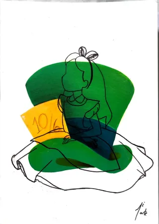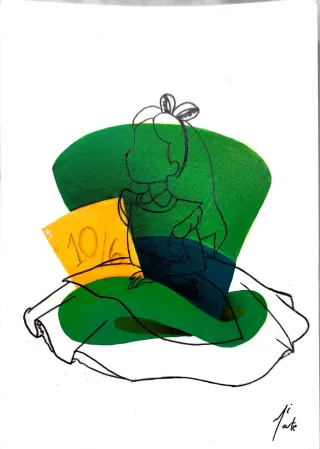 Ilustración de Alicia en el País de las Maravillas, tamaño A5. Presenta un diseño lineal sobre un fondo de colores vibrantes. - Dibujo a tinta negra. - Tonos verdes y amarillos. - Motivo de Alicia. - Formato A5. -Pintado a mano en acrílico y pastel
