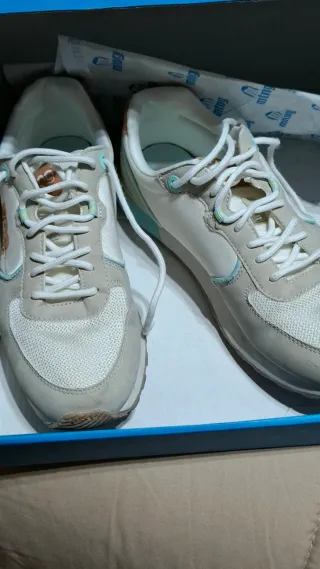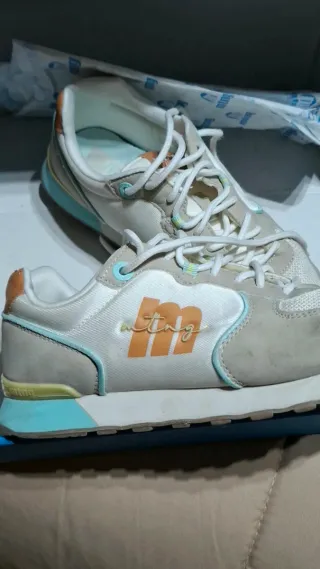 Zapatillas de la marca Mustang en tonos beige y turquesa. - Diseño deportivo. - Detalle de logo en el lateral. - Cierre con cordones -En perfecto estado