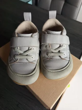 Zapatillas de bebé color gris, perfectas para los primeros pasos. - Cierre de velcro. - Suela de goma. - Detalle de cordones.