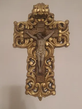 Antiguo crucifijo con un diseño ornamentado y detalles dorados. La figura de Cristo está elaborada con un acabado realista. - Marco de estilo barroco. - Figura de Cristo detallada. - Acabado en dorado y tonos tierra.