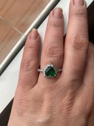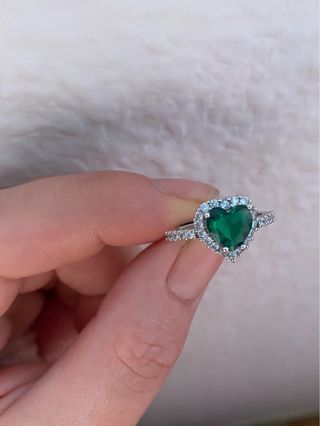 Elegante anillo con un diseño de corazón y detalles brillantes. - Piedra central en forma de corazón de color verde intenso. - Aro adornado con pequeñas gemas transparentes. - Montura en tono plateado.