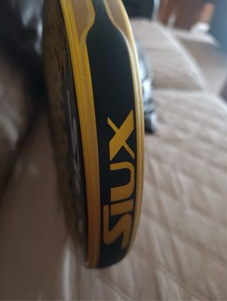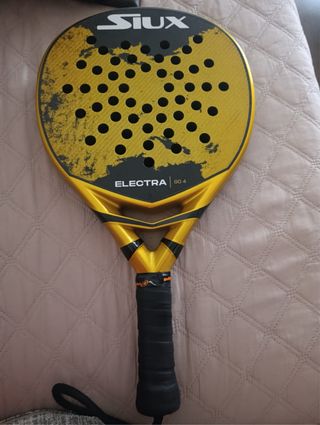 Raqueta de pádel Siux Electra GO 4 en color amarillo y negro. Diseño moderno y llamativo. - Marco con protector. - Acabado rugoso en la superficie. - Empuñadura negra. Esta nueva solo algún entrenamiento, se vende por no adaptarse a ella.