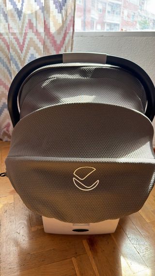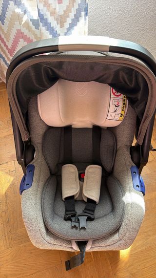 Silla de coche para bebé con un diseño moderno en tonos grises y beige. - Incluye reductores para recién nacidos. - Arnés de seguridad de 5 puntos.