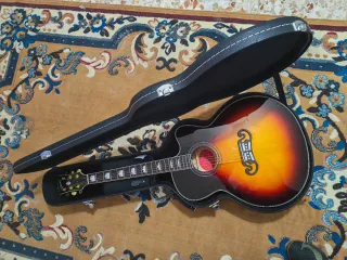 Guitarra electroacústica Gibson SJ200 con un acabado sunburst degradado. - Cuerpo con acabado brillante. - Mástil con incrustaciones de naca - Incluye funda rígida. Características principales: Cuerpo: Super Jumbo Tapa: Abeto Sitka macizo Aros y fondo: Arce (maple) Mástil: Arce Diapasón: Palisandro Escala: 25.5" (647 mm) Trastes: 20 Puente: “Moustache” de palisandro Golpeador: Grande con grabado floral Sonido: Muy potente, graves profundos y agudos claros
