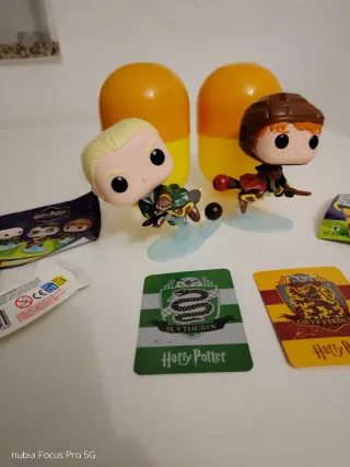 Dos figuras Funko Pop de Harry Potter, una de Slytherin y otra de Gryffindor. Incluyen sus bases transparentes y un balón de Quidditch. - Figura de Slytherin. - Figura de Gryffindor. - Dos cartas coleccionables de casas de Hogwarts. - De Kinder gran sorpresa edición especial.