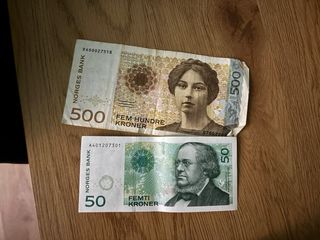 Dos billetes de colección de Noruega. - Un billete de 500 coronas noruegas. - Un billete de 50 coronas noruegas.