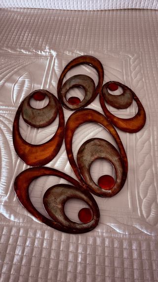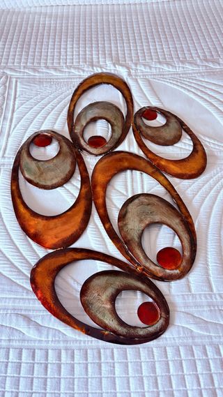 Original pieza decorativa de metal con un diseño moderno. - Diseño de óvalos entrelazados. - Detalles en tonos cobrizos y grises. - Acentos en rojo vibrante.