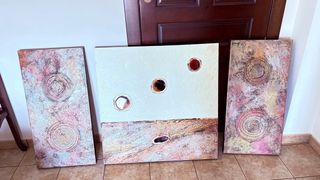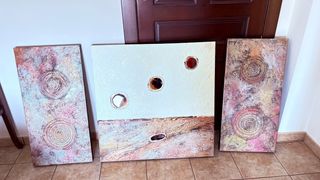 Conjunto de tres cuadros decorativos con un diseño abstracto y texturizado. - Cada pieza presenta un patrón circular en relieve. - Combinación de colores beige y multicolor. - Materiales de piedra y madera.