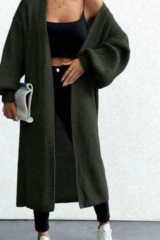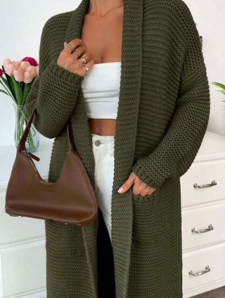 Cárdigan largo de punto en un bonito tono verde oliva. Es una prenda cómoda y versátil. - Tejido de punto grueso. - Diseño abierto. - Bolsillos frontales.