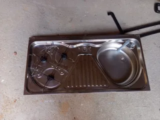 Conjunto de fregadero y cocina de gas con 3 fuegos para camping, caravana, autocaravana o camping. Fabricado en acero inoxidable. - Fregadero con desagüe y grifo - Tres fuegos. - Rejilla de soporte para ollas. - Medidas en la última foto - Hago envios