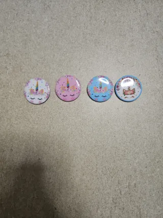 Conjunto de cuatro chapas decorativas con diseños de unicornios. - Diseños variados con unicornios. - Colores alegres y llamativos. - Ideales para personalizar mochilas o ropa.