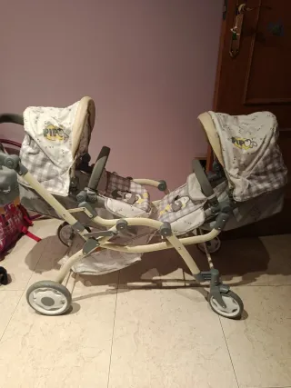 Carrito gemelar de la marca Pipo, ideal para llevar a dos muñecos. - Diseño a cuadros grises y blancos. - Capotas con estampado. - Cesta inferior. - Ruedas delanteras giratorias. - Solo jugó el día q se lo entregó papanoel -Si roces sin golpes ni rotos -solo una pequeña cosilla q sale en la foto Valorado en 125€ PRECIO NO NEGOCIABLE AL QUE ESTA PUESTO. -posiblemente hasta tenga la caja.