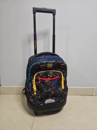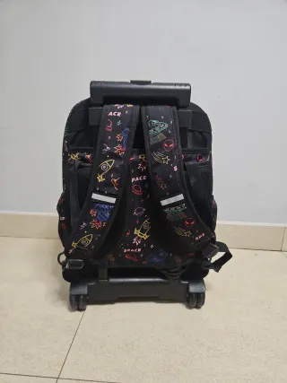 Mochila con ruedas y un divertido diseño espacial, perfecta para llevar tus cosas. - Diseño con cohetes, ovnis y estrellas. - Cremalleras de colores. - Asa extensible y ruedas para facilitar el transporte.