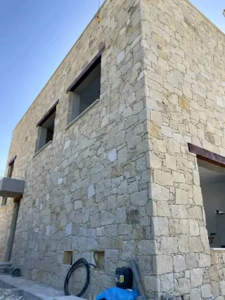 Fachada de piedra natural para exterior. Ideal para construcciones rústicas o modernas. - Piedra caliza de tonos beige y grises. - Acabado irregular y texturizado. - Resistente a la intemperie.