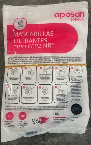 Lote de 5 Mascarillas filtrantes tipo FFP2 NR de la marca Aposan. 1 unidad por paquete. Fecha de caducidad Septiembre 2926. - Fabricadas en España. - Estructura de 5 capas. - Filtración de partículas ≥94%. - Tejidos suaves que no irritan la piel. - Medidas: 155 x 110 mm. - Cumple la Norma EN y el Reglamento de equipos de protección individual.