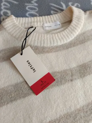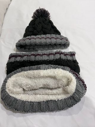 Conjunto de gorro y braga de cuello para niño, tejido con un diseño de trenzas y detalles a rayas. - Gorro con pompón. - Braga de cuello a juego. - Tejido de punto grueso.