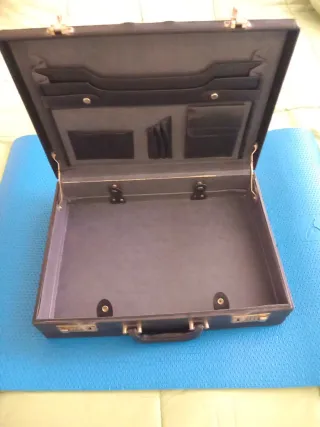 Maletín de herramientas de color marrón oscuro. Tiene un diseño con divisiones cuadradas en la tapa y cierres metálicos. - Cierres de seguridad. - Asa para transporte. Se vende por 15 euros. - Malting de acero inoxidable en condition acceptable se vende por 10 euros