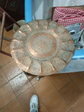 Precioso plato decorativo de cobre con un intrincado diseño labrado, inspirado en el arte marroquí. - Material: Cobre. - Diseño: Labrado con motivos florales y geométricos. - Estilo: Marroquí. 35 cm