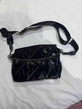 Bolso de la marca Misako en color negro. Un accesorio con un diseño moderno y detalles que marcan la diferencia. - Cadena decorativa en la parte frontal. - Charms colgantes con forma de estrella y rayo. - Correa ajustable para llevar al hombro o cruzado.