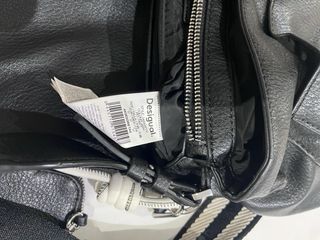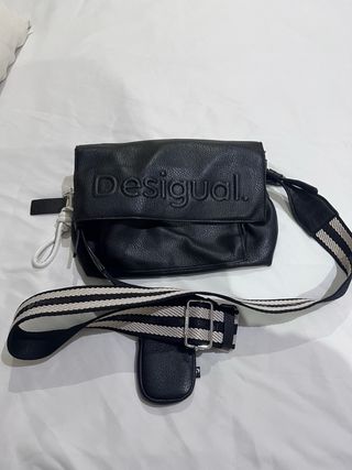 Bolso de la marca Desigual en color negro. - Diseño con logo en relieve. - Correa ajustable con diseño de rayas blancas y negras. - Incluye un pequeño accesorio o monedero a juego.