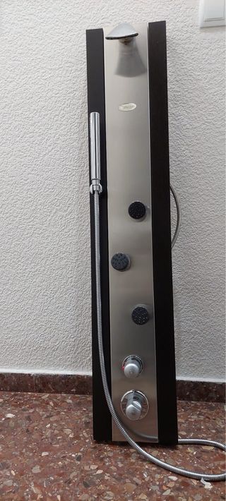 Columna de ducha con sistema de hidromasaje. - Panel de ducha con acabado en madera y metal. - Incluye rociador superior y teleducha. - Válvulas y jets de hidromasaje. - Diseño moderno y funcional.