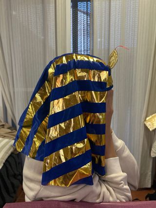 Accesorio para la cabeza con diseño de faraón. - Detalle dorado en la parte superior. - Tiras azules y doradas. - Adorno rojo en la punta.