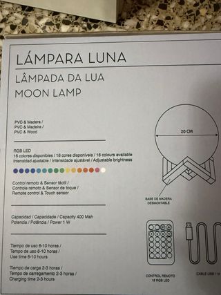Lámpara con diseño de luna, ideal para añadir un toque especial a cualquier espacio. Ofrece 16 colores de luz que se pueden cambiar al tocar la luna o mediante un control remoto.