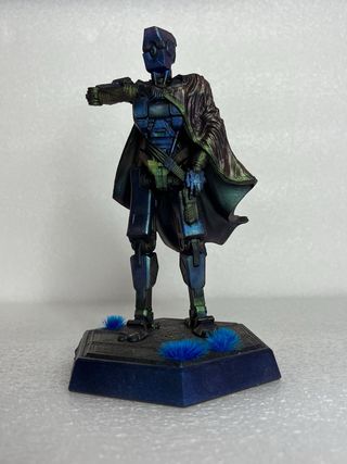 Figura decorativa de resina con diseño de robot. - Pintura efecto iridiscente. - Cambia de tono en función del tipo y el ángulo de la luz. - Diseño futurista. - Aproximadamente 14cm de alto y 9cm en su parte más ancha