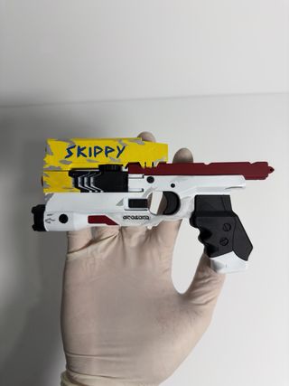 Réplica de Skippy inspirada en el videojuego Cyberpunk 2077, compacta. Modelo para solo exhibición, no es un juguete ni réplica a escala real, es más compacta, material resina, como se señala es frágil no es para usarse como complemento de disfraces. Es exclusivamente para exhibirse en una estantería. - Diseño inspirado en el arma del juego. - Acabado blanco y rojo con detalles. - Inscripción Skippy en la parte superior