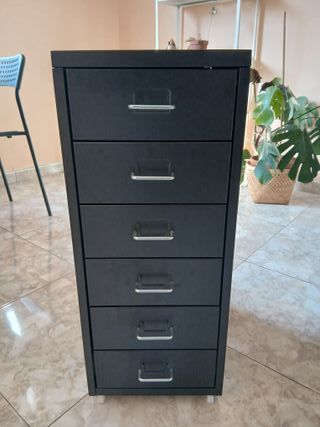 Cajonera metálica de seis cajones, ideal para organizar tu espacio. - Diseño moderno y funcional. - Tiradores plateados. - Ruedas para fácil movilidad.
