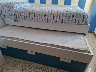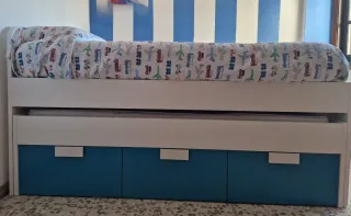 Cama nido práctica y funcional, con espacio de almacenamiento. - Tres amplios cajones integrados. - Diseño moderno en blanco y verde. Se vende con el colchón de la cama nido. No está incluido el colchón principal. La cama ya está desarmada.