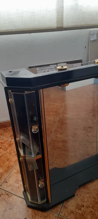 Mueble con detalles de espejo y diseño de rincón. - Acabado en negro con detalles dorados. - Puertas de cristal facetado. - Tiradores de cristal.