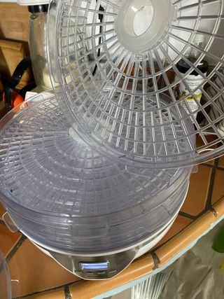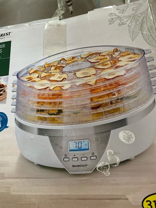Deshidratador de alimentos SilverCrest con 5 niveles para secar frutas, verduras, hierbas y más. - Diseño moderno en blanco y plateado. - Pantalla digital con controles. de temperatura y tiempo - Bandejas transparentes apilables.