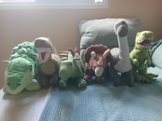 Conjunto de seis dinosaurios de peluche de Ikea. No se venden por separado. (De 45 cm y 55 cm) - Incluye un Triceratops. - Incluye un Stegosaurus. - Incluye un T-Rex. - Incluye un Brontosaurus. - Incluye un Ankylosaurus. - Incluye un Dilophosaurus.