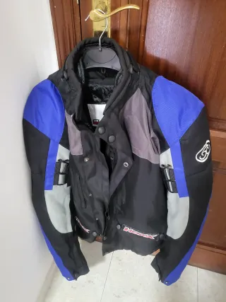 Chaqueta de moto en buen estado, ideal para protegerte en tus rutas. - Diseño en color negro, azul y gris. - Cierre frontal con cremallera y solapa. - Ajustes en cintura y mangas. Talla M, válido a talla L