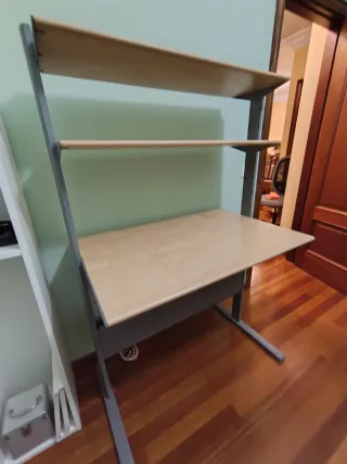 Escritorio con un diseño moderno y funcional. - Estructura principal de metal resistente. - Superficie de trabajo en madera. - Acabado en tonos beige y gris. - medidas 62 fondo x 94 ancho x 150 alto. - medidas estantes 33 x 91
