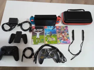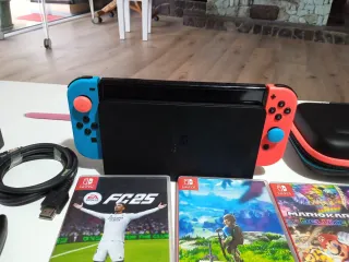 Consola Nintendo Switch OLED con Joy-Cons en colores azul y rojo neón. Fecha de compra: 09/2024. Estado: en perfecto funcionamiento, incluye todos los accesorios originales. Incluye además una funda rígida, un mando extra de Zelda. Además 3 juegos: Zelda Breath of the Wild, Mariokart Deluxe y Fc 25. - Pantalla OLED de 7 pulgadas - Tarjeta microSd de 64 GB. El precio incluye los juegos, también se pueden vender por separado.