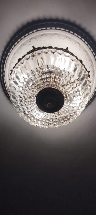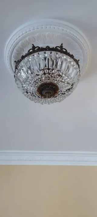 Elegante lámpara de techo con un diseño clásico y detalles ornamentales. - Estructura principal de metal con acabado dorado. - Cristales transparentes que refractan la luz. - Rosetón decorativo en la base de montaje. Tenemos dos lámparas de 45 cm de diámetro por 33 cm de altura, se venden juntas o por separado, las dos por 80€, una 50 €.