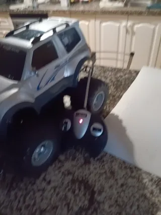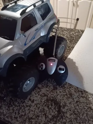 Coche teledirigido con tracción 4x4. - Diseño deportivo plateado con detalles azules. - Ruedas grandes para todo terreno. - Incluye mando a distancia.