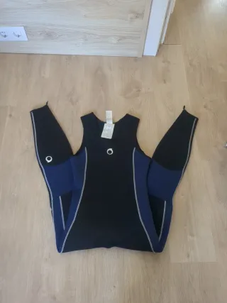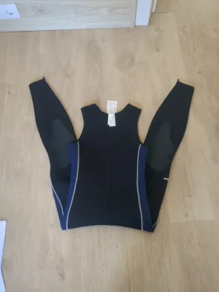 Este neopreno sin mangas es ideal para actividades acuáticas. Su diseño combina paneles negros y azules con costuras plateadas. Talla S - Tirantes anchos. - Paneles laterales en azul. - Refuerzo rodillas para vela ligera - 5.5mm grosor