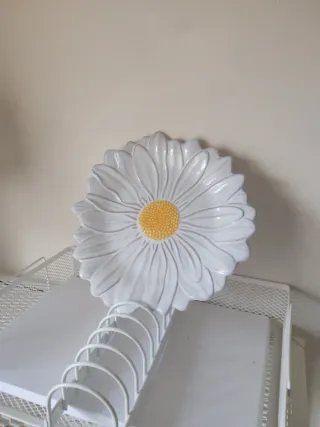 Plato de postre con un diseño inspirado en una margarita, de la reconocida marca Bordallo Pinheiro. - Pieza de cerámica con detalles en relieve. - Centro del plato en color amarillo. - Borde exterior blanco con pétalos. - Diámetro aproximado: 23 cm.