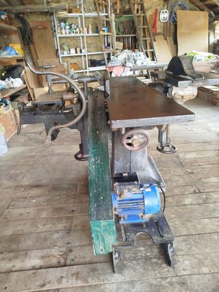 CEPILLADORA: Estructura de hierro fundido con ménsulas de acero; mesa de 36 cm de ancho y 1,75 m de largo; diámetro del cepillo 85 mm; 2 cuchillas; motor monofásico 230 V de 3 CV; guardamotor Telemecánica; funciones de cepillo, sierra y taladro o fresa; antigua, pero en buen uso. ⸻ REGRUESADORA: Estructura de hierro fundido con ménsulas de acero; mesa de 50 cm de ancho y 1,10 m de largo; diámetro del cepillo 95 mm; 2 cuchillas; capacidad de regrueso 25 cm; motor monofásico 230 V de 3,5 CV; guardamotor Telemecánica; función de regruesado; antigua, pero en buen uso. Telefono de contacto:605 47 76 34 Tineo,Asturias