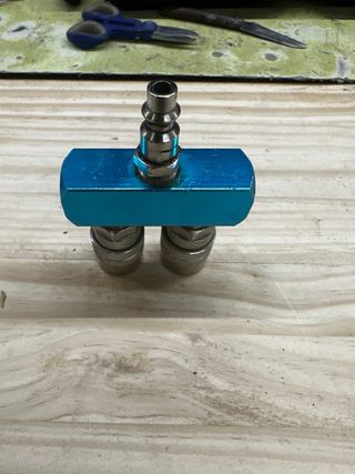 Conector para mangueras de aire de compresor. Permite conectar dos mangueras a una sola salida. - Fabricado en aluminio de color azul. - Dos salidas para manguera. - Una entrada superior.