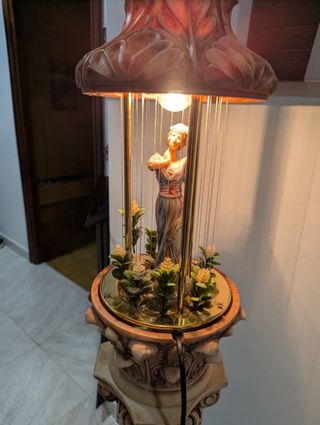 Lámpara de Lluvia de Aceite Vintage con Pedestal - Estilo Griego (Para Restaurar) Descripción: Se vende espectacular lámpara de lluvia de aceite original de los años 70, una pieza de decoración retro icónica y muy difícil de encontrar con su columna completa. Características principales: Diseño: Estilo clásico con figura femenina central rodeada de vegetación artificial. Estructura: Incluye el pedestal tallado estilo columna corintia a juego. Material: Acabado tipo resina/cerámica con pátina envejecida Hay k revisar la bomba aceite porque estara trabada de no usar. El resto impecable. Oportunidad para coleccionistas!