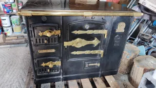 Cocina calefactora cerrada de la marca Lacunza N 9, se quito por reforma funcionando, con la paila sin fugas en circuito cerrado con 1,5 bar de presion. El frontal esta muy bien, tiene algun pequeño desperfecto en la chapa que la cierra fácilmente reparables. - Acabado principal en negro. - Detalles ornamentales en dorado.