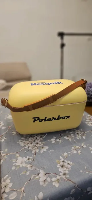 Nevera portátil Polarbox con diseño retro, ideal para mantener tus bebidas y alimentos frescos. Nunca ha sido usada. - Color amarillo y detalles en marrón. - Asa superior para facilitar el transporte.