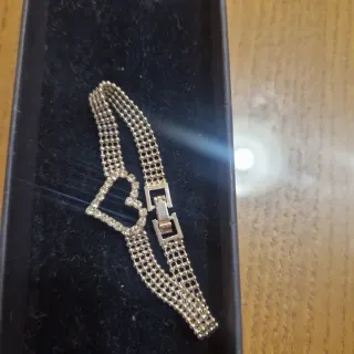 Elegante pulsera con un diseño de corazón adornado con pequeñas incrustaciones brillantes. La cadena está compuesta por múltiples hilos finos que le dan un aspecto delicado y sofisticado. Cuenta con un cierre de tipo mosquetón para mayor seguridad. - Diseño de corazón central. - Cadena de múltiples hilos. - Cierre de mosquetón.