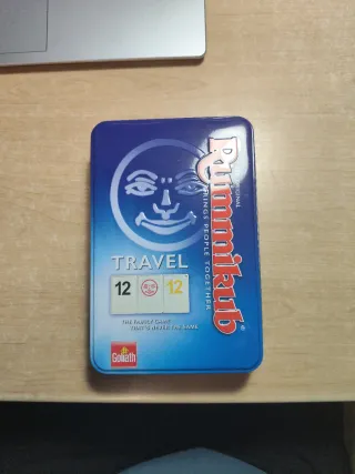 Juego de mesa Rummikub en su versión Travel, ideal para llevar a todas partes. Es la versión original del juego. - Caja metálica azul. - Incluye fichas y soportes. - Diseñado por Goliath.